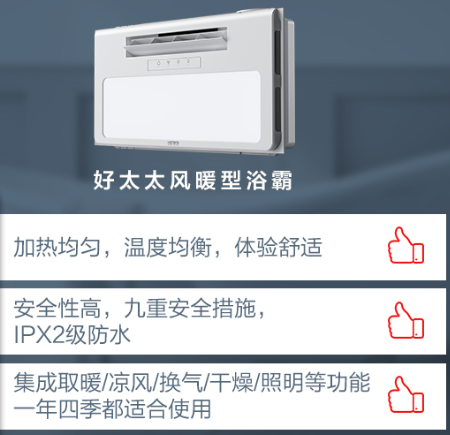 而好太太智能浴霸,加热均匀,温度均衡,体验舒适;安全性高,九重安全措施,IPX2级防水;集取暖、凉风、换气、干燥、照明等功能于一体,一年四季都适合使用!