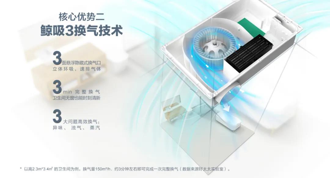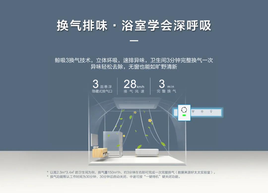 浴室有异味怎么办?打开换气排味功能,3面悬浮隐藏式换气口,每小时28公里换气风速,3分钟就能完整换气一次,浴室从此学会深呼吸!