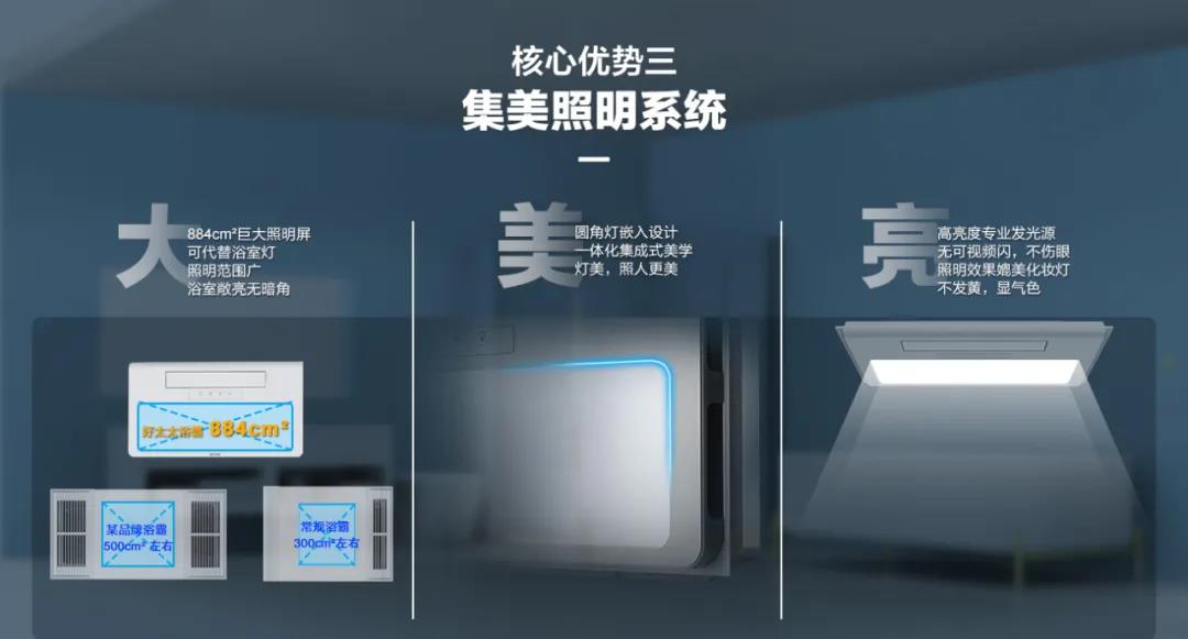 浴室灯也不将就!好太太智能浴霸,采用884平方厘米巨大照明屏,照明范围广,不伤眼,高亮度高显色,媲美化妆灯,更显气色人更美!